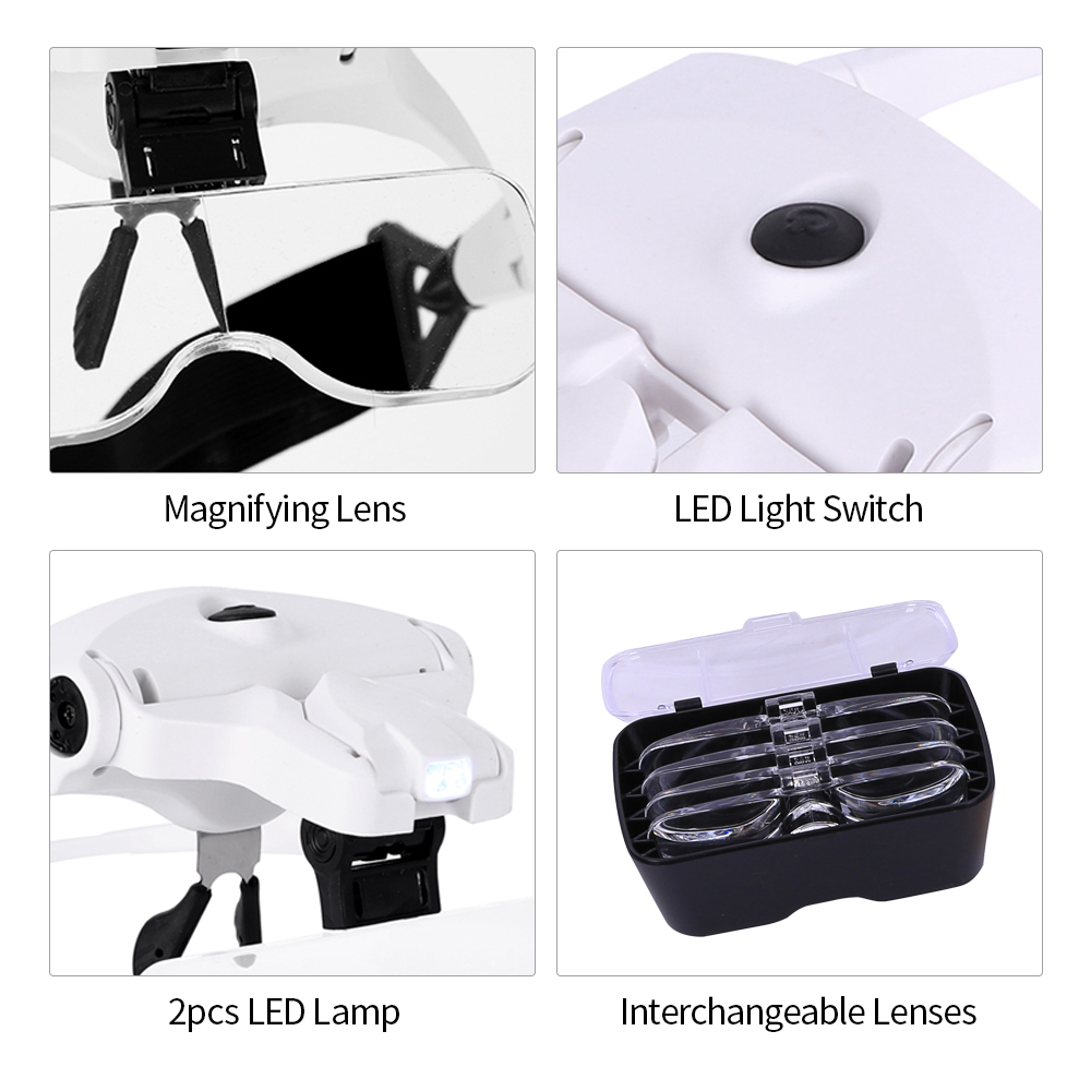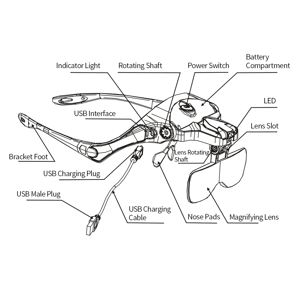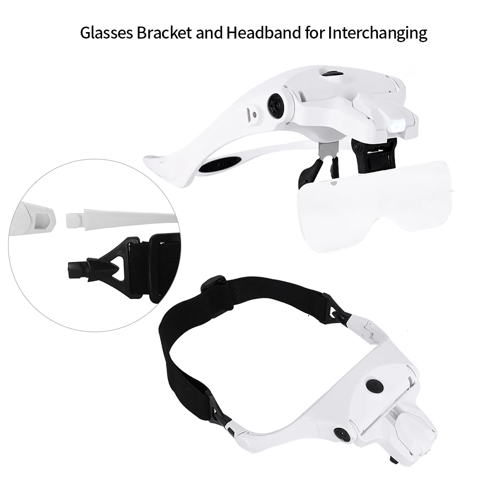 2. Glasses Leg & Headband Switchable: Press the side button to take down glasses legs and mount headband for replacement; This design solves the problem of heavy loading. Common bracket-type eyeglasses magnifier is easy to fall off due to heavy weight of lens and led light module, while this item can solve such a problem completely. If long time use is needed, you can transfer the eyeglass legs into headband state, which can work comfortable and never fall down.